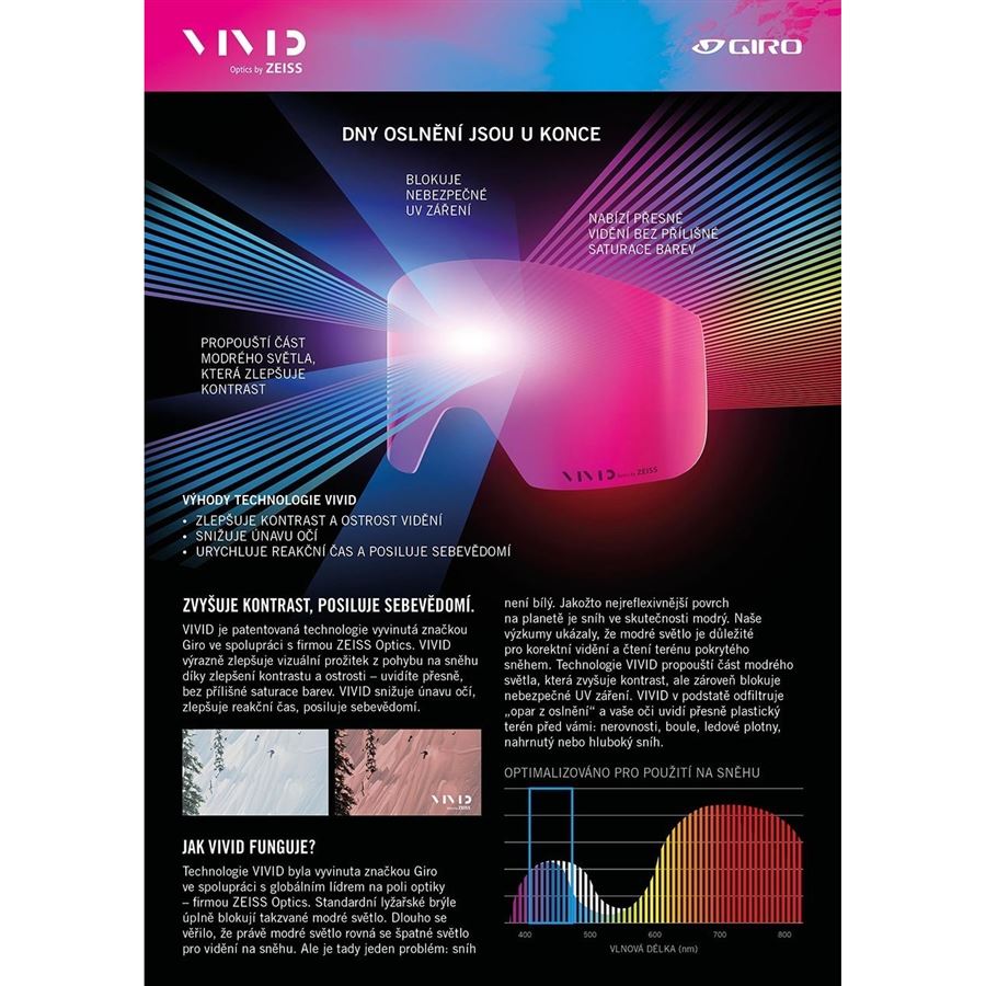 Technologie VIVID byla vyvinuta značkou Giro ve spolupráci s globálním lídrem na poli optiky – firmou ZEISS Optics. Standardní lyžařské brýle úplně blokují takzvané modré světlo. Dlouho se věřilo, že právě modré světlo rovná se špatné světlo pro vidění na sněhu. Ale je tady jeden problém: sníh není bílý. Jakožto nejreflexivnější povrch na planetě je sníh ve skutečnosti modrý. Naše výzkumy ukázaly, že modré světlo je důležité pro korektní vidění a čtení terénu pokrytého sněhem. Technologie VIVID propouští část modrého světla, která zvyšuje kontrast, ale zároveň blokuje nebezpečné UV záření. VIVID v podstatě odfiltruje „opar z oslnění“ a vaše oči uvidí přesně plastický terén před vámi: nerovnosti, boule, ledové plotny, nahrnutý nebo hluboký sníh.