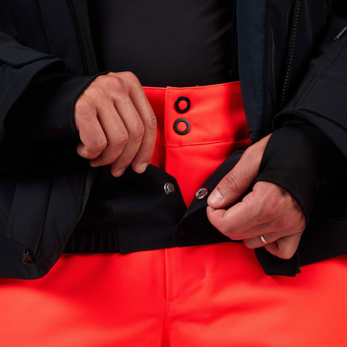 Funkce lyžaře: integrovaný sněhový pás, manžety s poutky na palec, větrací zipy, poutko na brýle
